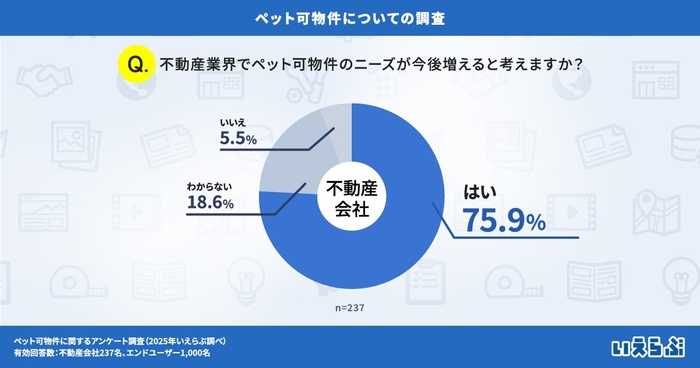 不動産会社に対し、今後のペット可物件のニーズについて尋ねたところ、「はい」と答えた不動産会社は75.9%、「わからない」が18.6%、「いいえ」が5.5%という結果となりました。