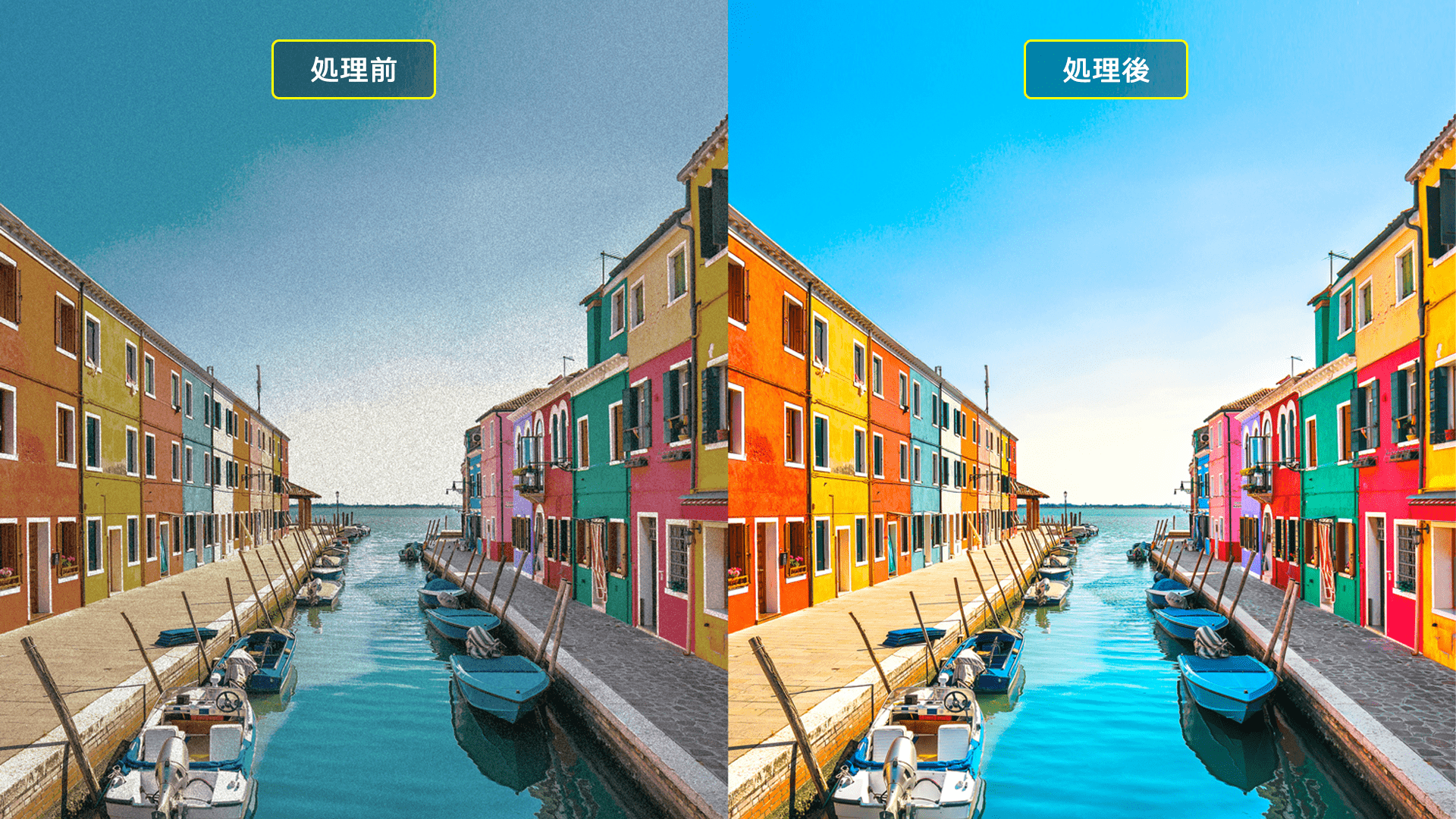 文字周辺とエッジ部に出るノイズ処理以外に、映像の平坦部における波線のようなノイズを最大限に抑制できます。HDと2Kの映像を4K映像に巧みにアップスケーリングします。