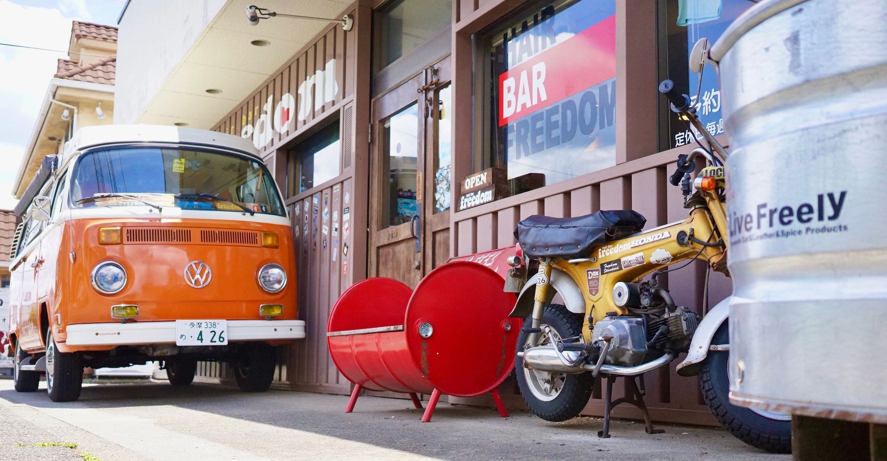 hair bar freedomの店前を彩るのは個性溢れるBike&Car。