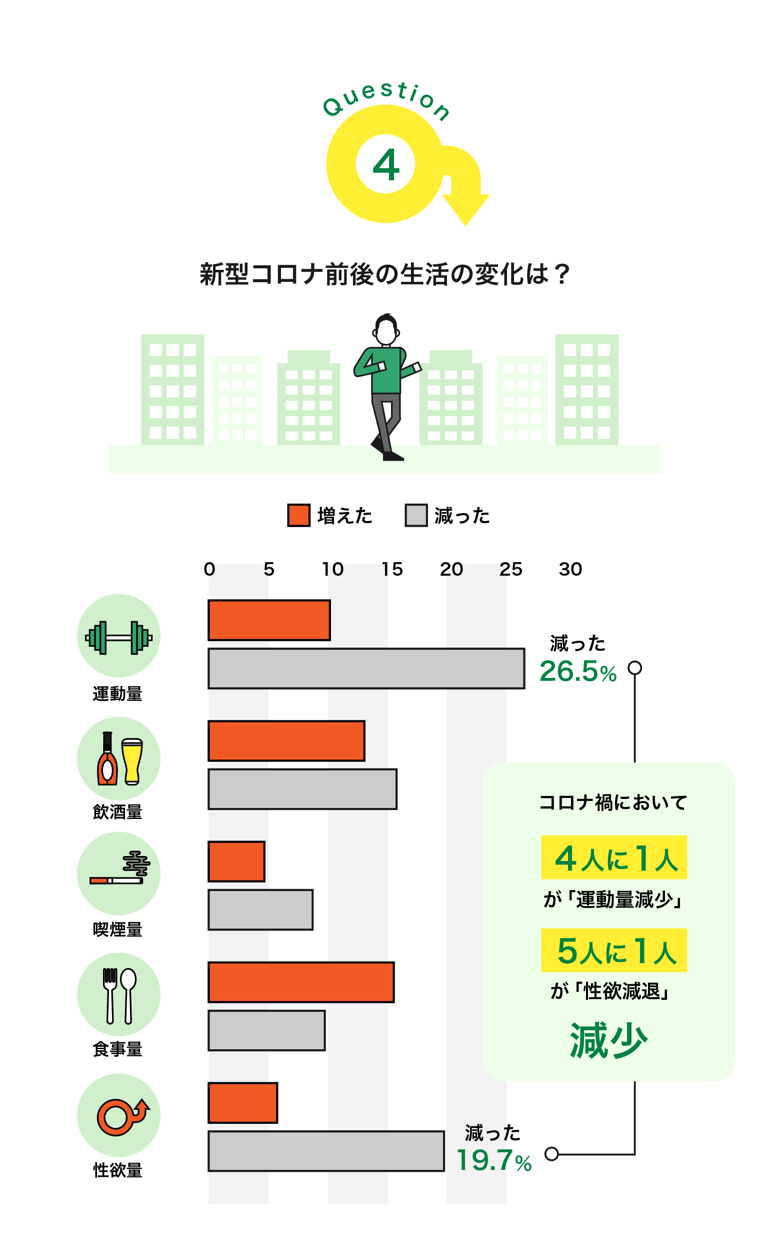 コロナ禍前後の生活の変化 「運動量」と「性欲」減少傾向に