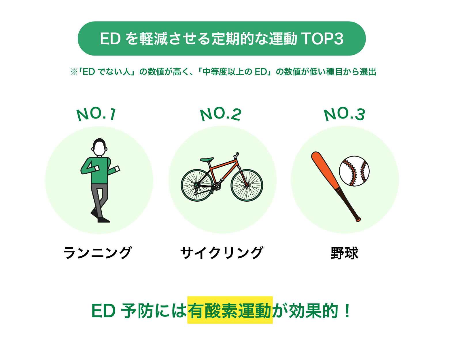有酸素運動とは、軽め~中程度の負荷を継続的にかける運動を指します。脂肪を燃焼させる効果があることから、生活習慣病予防の代表的な対策として知られていますが、今回の調査ではED予防にも有効であることが証明されました。