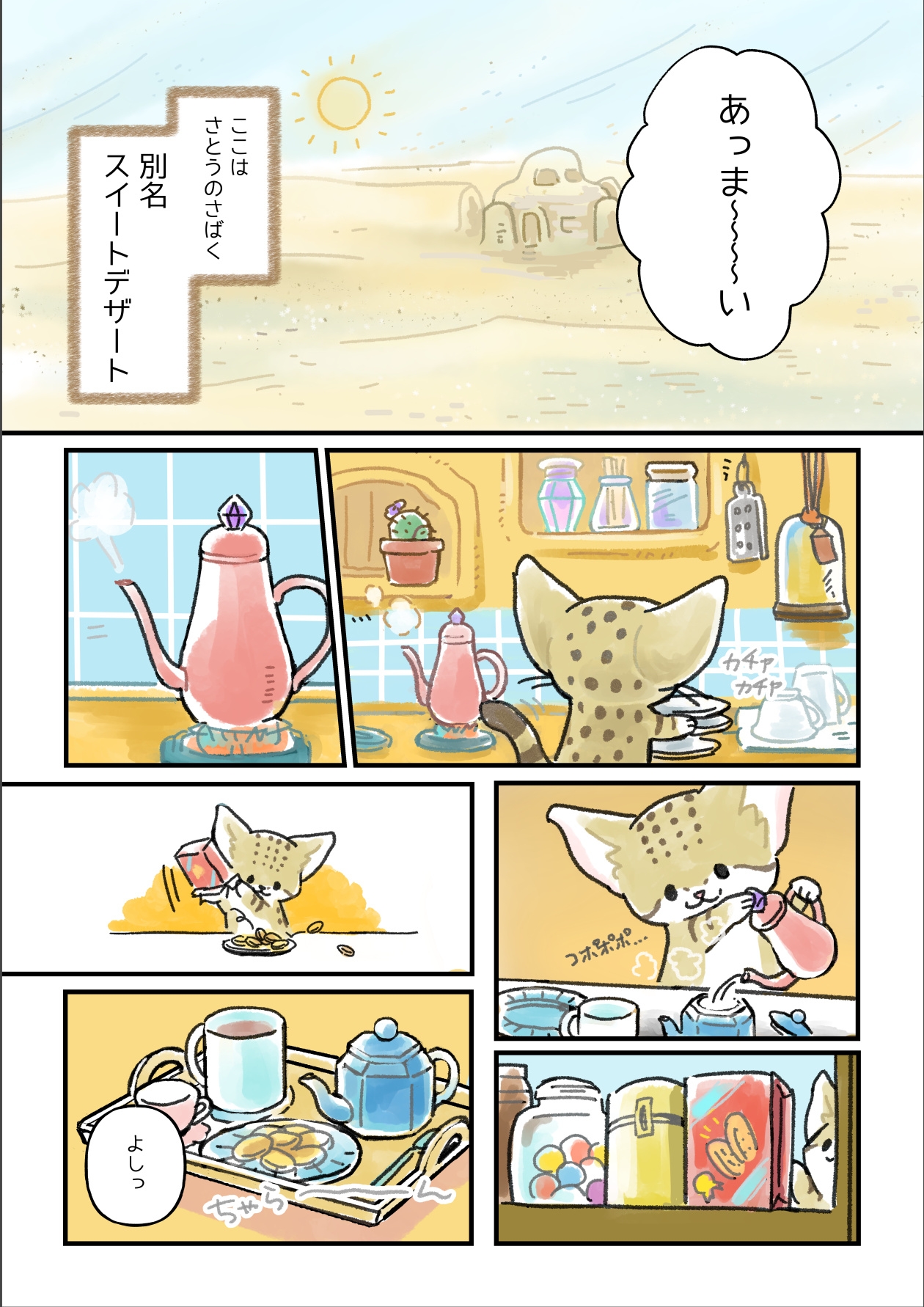 お砂糖の砂漠に住む、しゅがねこのスナのいえにまったりねこのマヌがやってきて…