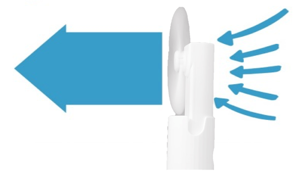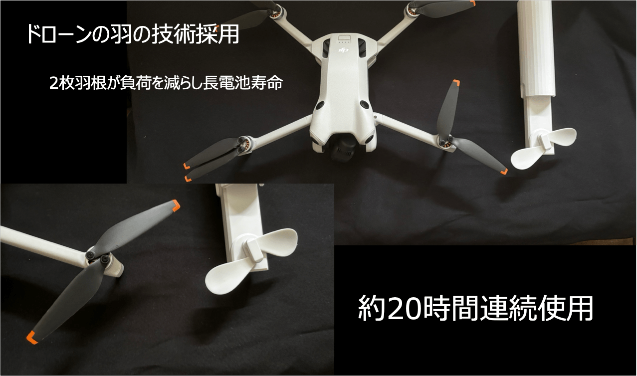 長時間飛行が必要なドローンの羽根の技術を採用。2枚羽根は空気抵抗が少なく省エネ。長時間動作が可能になります。更に羽が少ないと風を切る音が小さくなります。