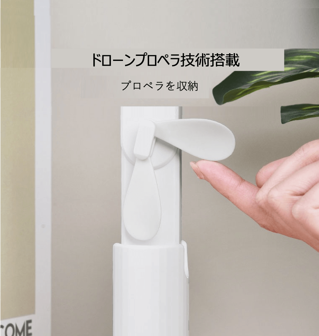 ドローンのように2枚のプロペラは独立。望遠鏡のように回転部が伸び縮みしコンパクトに収納できます。手のひらサイズで収納場所を選びません。いつでもどこでも簡単に涼しい風を体感できます。