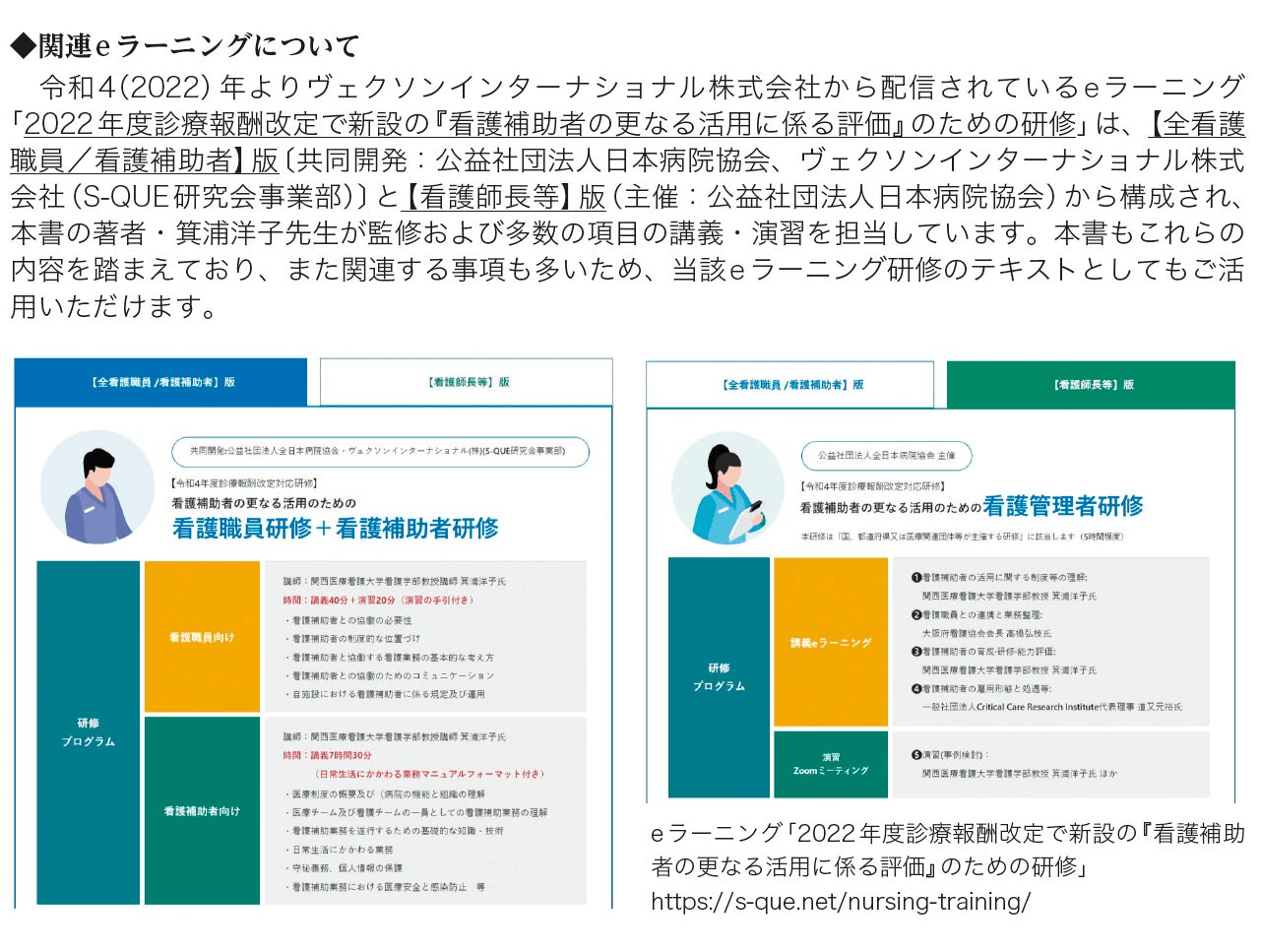 また、本書はeラーニング「2022年度診療報酬改定で新設の『看護補助者の更なる活用に係る評価』のための研修」に対応しています。