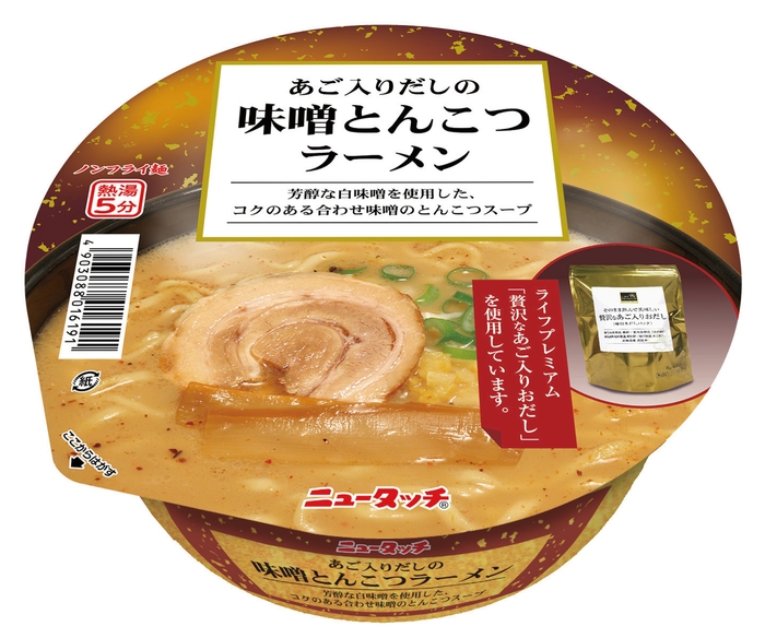 お湯を入れるだけで簡単においしくできて、時間がない時や保存に重宝するカップラーメン。1年の中で最もカップラーメンが売れる12月に、冷えた体をホッと温めるライフオリジナル商品が誕生いたしました。「ヤマダイ あご入りだしの味噌とんこつラーメン」は、「ライフプレミアム そのまま飲んでおいしい贅沢なあご入りおだし」の上品な魚介風味が香り、コクのある合わせ味噌を使用したとんこつスープに太麺が絡むプレミアムなカップラーメンです。アクセントに柚子と一味唐辛子を使用しているので、重すぎずスッキリとした後味をお楽しみいただけます。