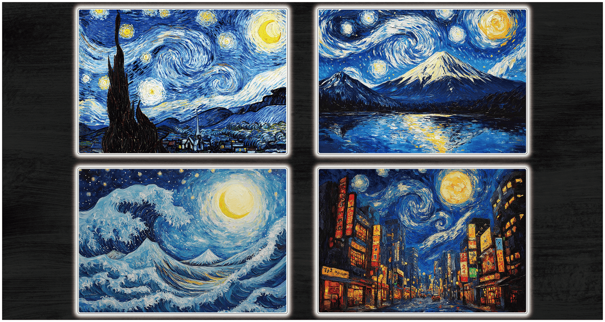 ゴッホの代表作「星月夜」を日本の四季や自然の情景と組み合わせ、全く新しいアートにしました。画像生成AIの技術を活用し、洗練されたデザインで他にはない癒しの空間を演出します。