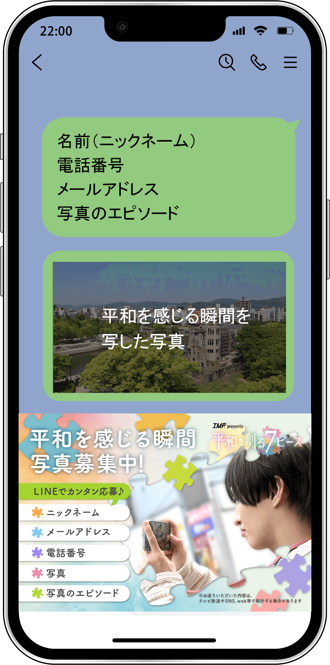 IMP. メンバーは一人ずつカメラを手に広島の地を巡り、「平和を感じる瞬間」を写真(peace sign)として切り取っていきます。メンバーは広島のどんな「景色」や「人」に平和を感じるのか。同時に県内の視聴者のみなさんからも写真「平和を感じる瞬間」を募集します。番組で日々紹介し、80年後の平和のカタチを共有していきます。