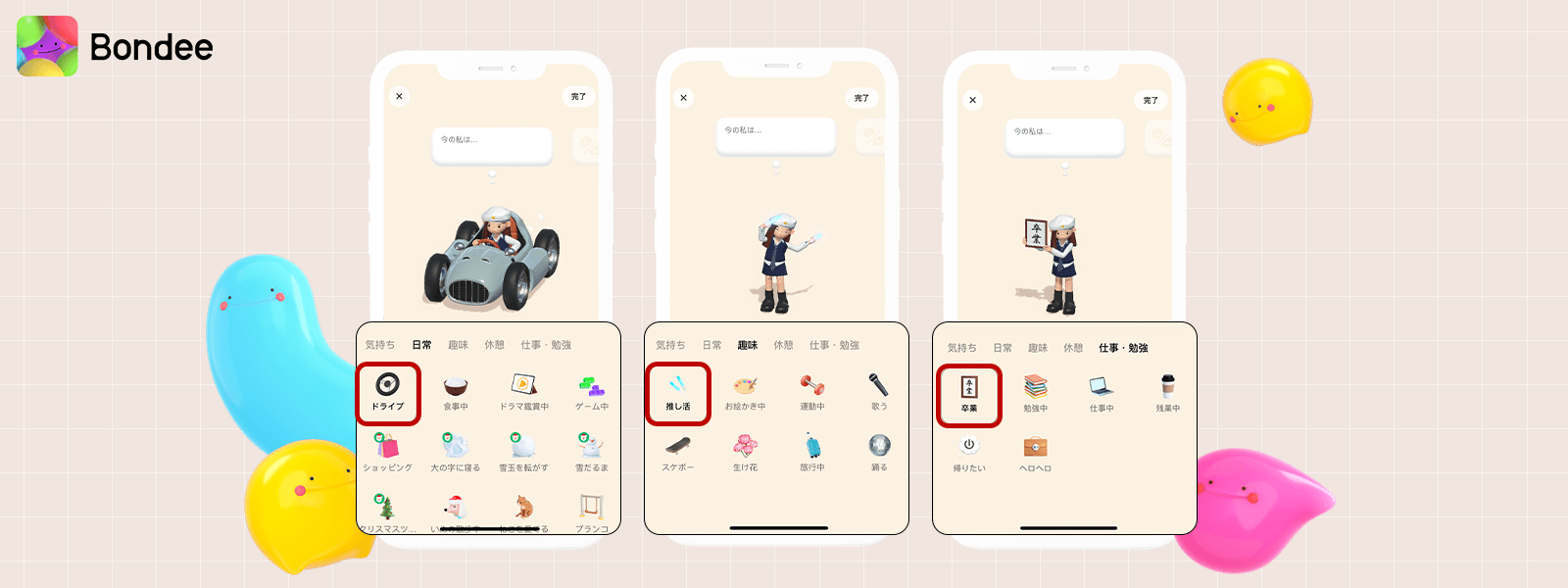 アバターのステータス投稿で使えるモーションの種類が『日常』からドライブ、『趣味』から推し活、『仕事・勉強』から卒業が増えました。