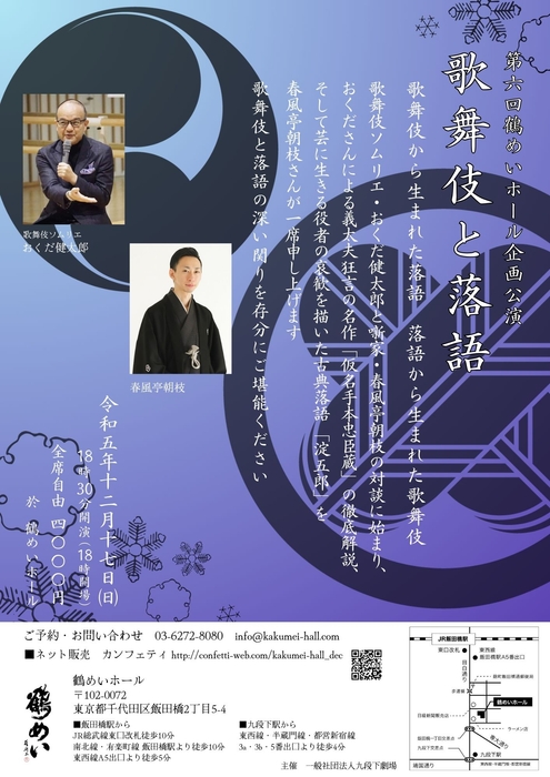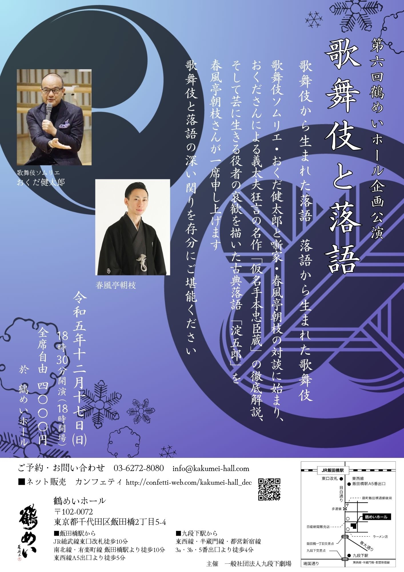 一般社団法人九段下劇場(代表:大木梨恵)主催、『歌舞伎と落語』が2023年12月17日 (日)に鶴めいホール(東京都千代田区飯田橋2丁目5-4)にて上演されます。