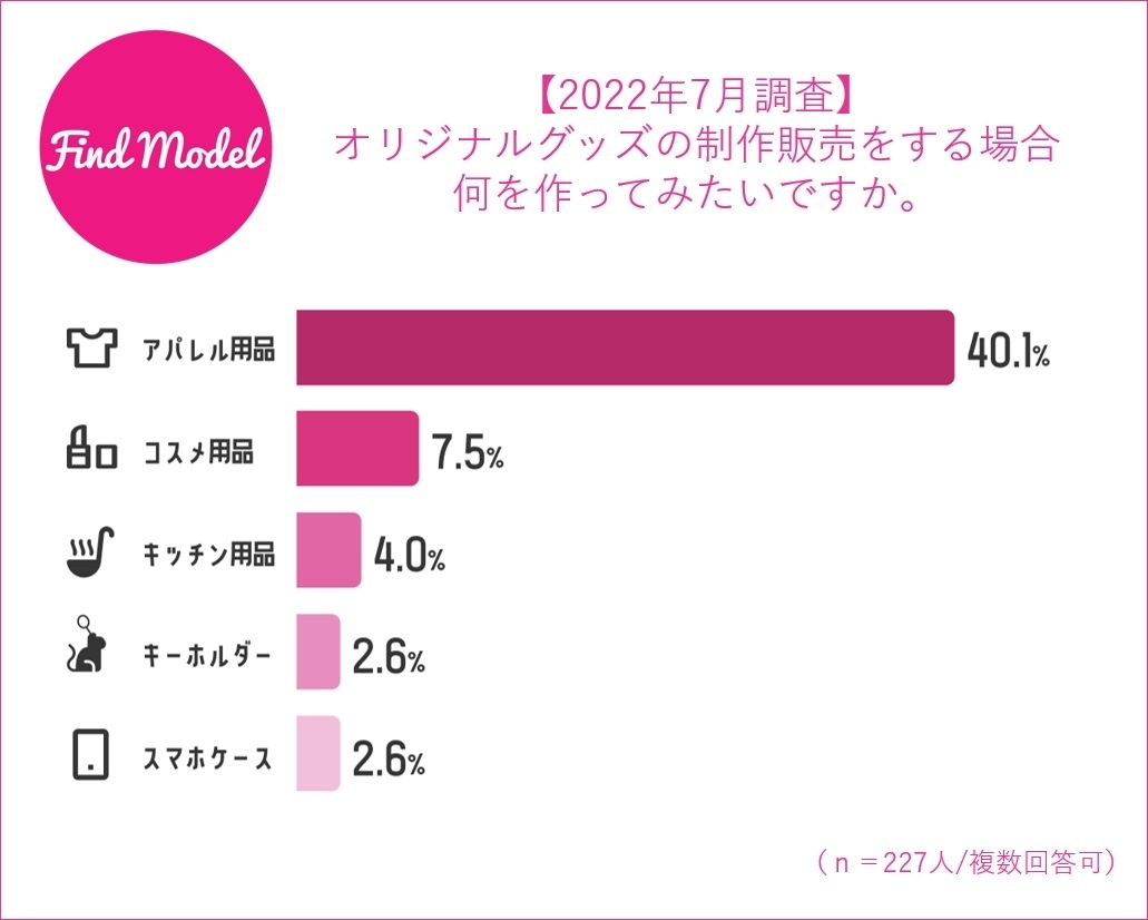 また今後オリジナル商品の制作販売してみたいアイテムとしては【アパレル用品】が40.1%と多い結果となりました。