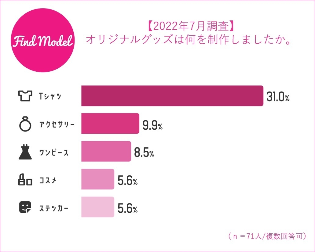 制作した商品としては【Tシャツ】が1番多く、続けて【アクセサリー】【ワンピース】【コスメ】【ステッカー】という結果となりました。