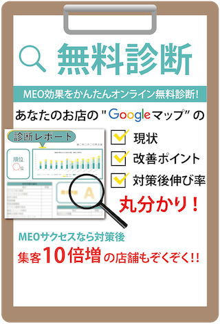 ※現在Googleビジネスプロフィールをご利用の店舗様は、 お店の"Google マップ”の現状と改善ポイントが分かる「無料診断」も実施しております。
