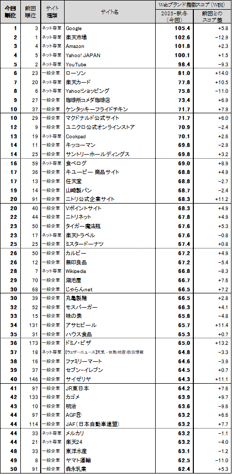 Webサイトのブランド力、総合編は「Google」が首位 一般企業サイト編の上位は、「ローソン」 「珈琲所コメダ珈琲店」「ケンタッキーフライドチキン」 「マクドナルド公式サイト」 日経BPコンサルティング調べ 「Webブランド調査2025-秋冬」