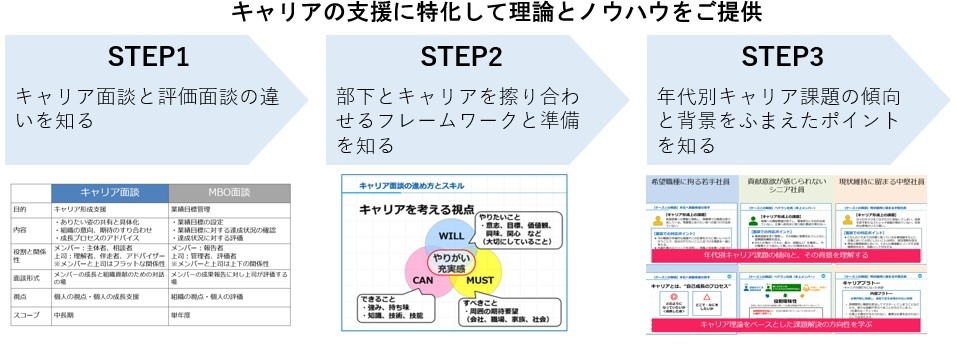 「部下のキャリアを支援すること」について理解し、フレームワークを学び、実際のケーススタディを通して明日から使えるように腹落ちさせます。