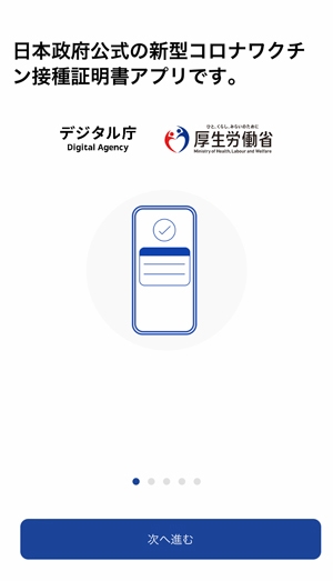 必ず「日本政府公式の新型コロナワクチン接種証明書アプリです」という文字があることと、デジタル庁、厚生労働省の表記があることを確認して進めてください。