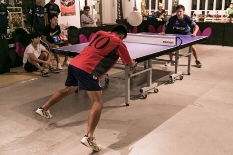 卓球のルールで専用ボールをヘディングのみで打ち合う、いわば“ヘディング卓球”です。