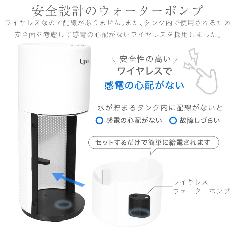 ・タンク内はワイヤレス給電を採用し感電しない安全設計