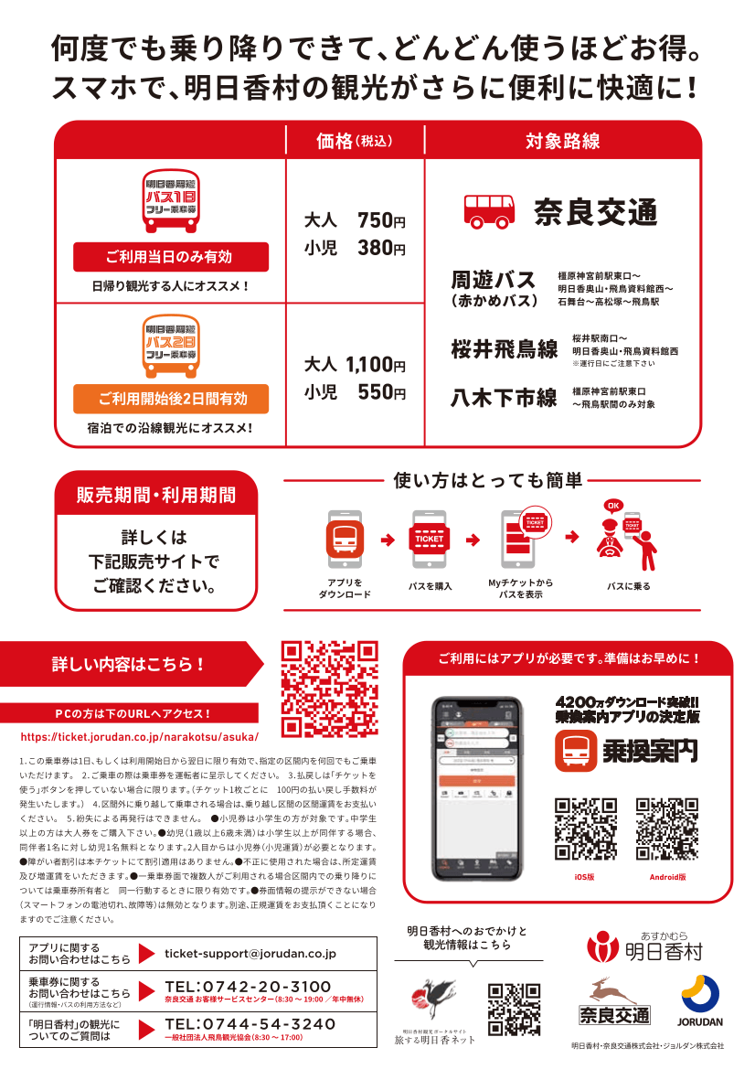 ジョルダン株式会社(本社:東京都新宿区、代表取締役社長:佐藤 俊和、以下「ジョルダン」)は、2024年4月22日(月)より、明日香村(所在地:奈良県高市郡明日香村、村長:森川 裕一)が委託し、奈良交通(本社:奈良県奈良市、代表取締役社長:田中 耕造)が運行する「明日香周遊バス『赤かめ』」等の明日香村エリアの路線バスが乗り放題となる「明日香周遊バス1日/2日フリー乗車券」をモバイルチケットで販売します。