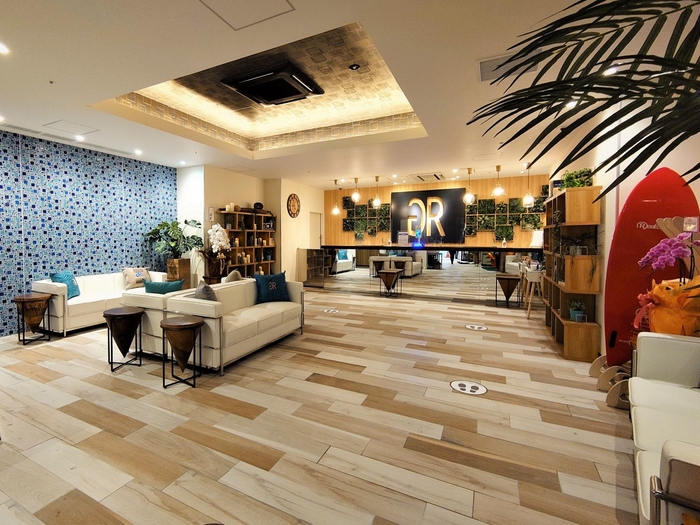 コンセプトである「海」・「太陽」をもとに、コバルトブルーを基調とし海をイメージしたエントランスから砂浜イメージのフロントへ流れるように。