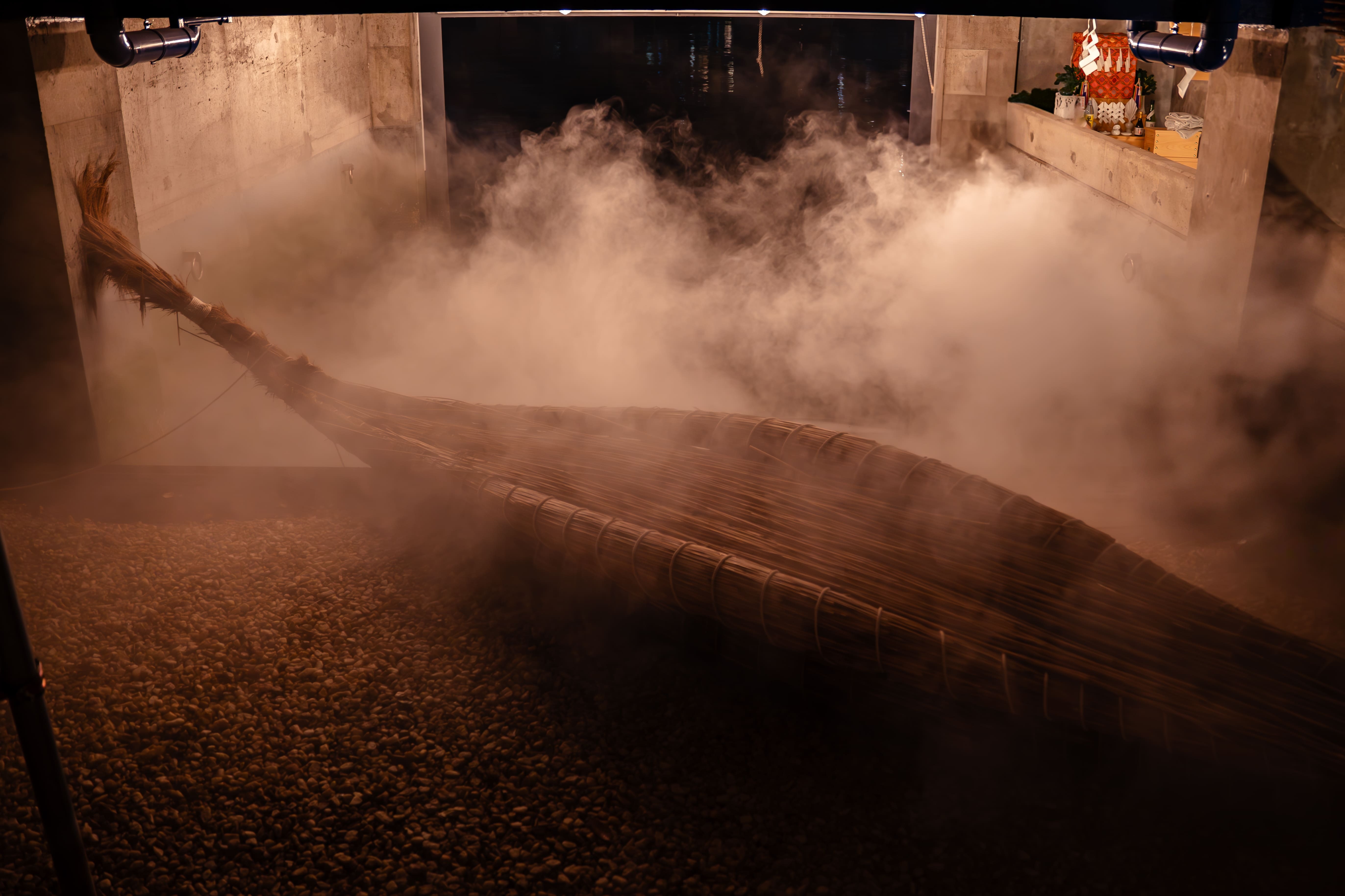 更に、参道のそばには神社の中まで運河が繋がっているだけではなく、そこには世界最古の船とされる葦船(あしぶね)を設置。運河の上に雲海が流れていく様子は圧巻。