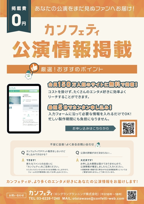 公演主催者が専用フォームから必要情報を入力するだけで、全国150万人以上の会員を抱えるカンフェティWEBサイトに、公演情報を無料で掲載できるサービスです。