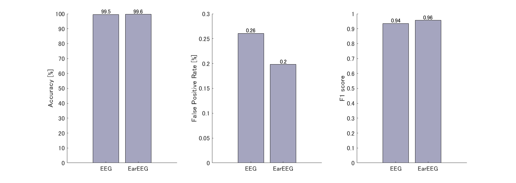 Note:グラフ左からAccuracy, False Positive Rate, F1 score、EEGは5ch・EarEEGは2ch