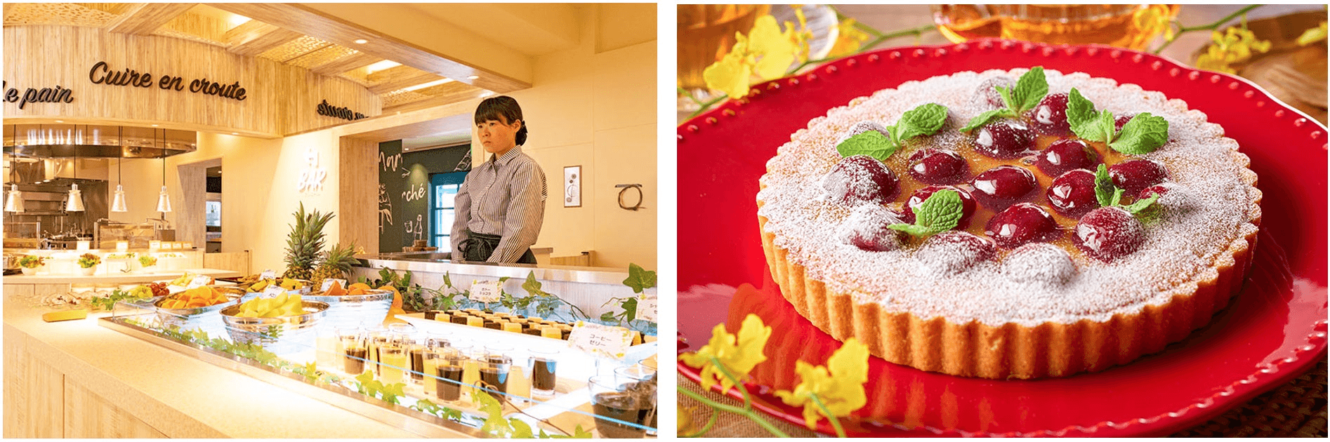 西海橋コラソンホテルのバイキングはデザートコーナーも必見。アイスクリームやフルーツはもちろん、和洋のデザートを食べやすいサイズで種類豊富にご用意しています。定番の美味しさに加え、秋限定のデザート「ダークチェリータルト クラシック」をお見逃しなく。サクサクのタルト生地に詰まったリッチな味わいのアーモンドクリーム。甘酸っぱいダークチェリーがアクセントです。