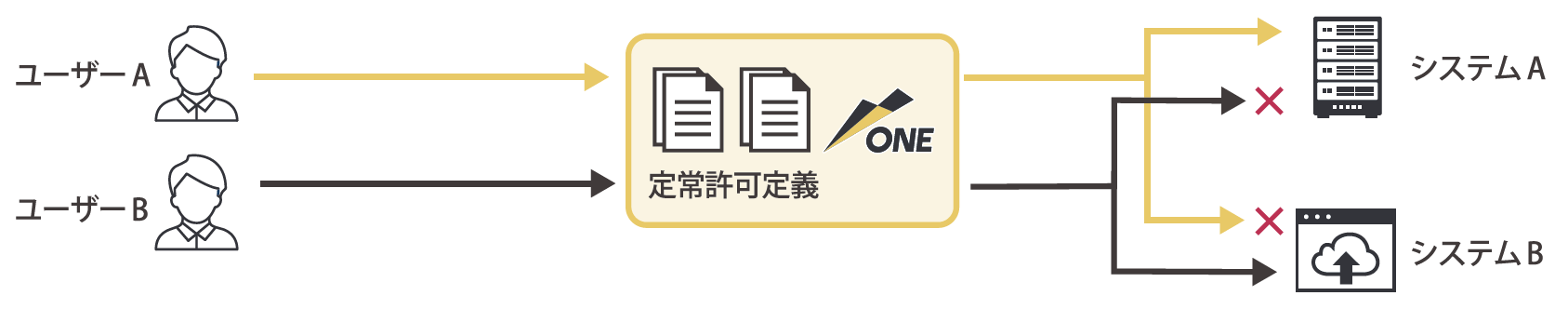 ESS AdminONEでは、ユーザーによる特権IDの不正使用を防止する仕組みとして、ワークフローシステムを用いた申請(および承認)ベースのアクセス許可の仕組みを提供しています。V1.2はそれに加え、ポリシーベースのアクセス許可を設定することが可能となりました。