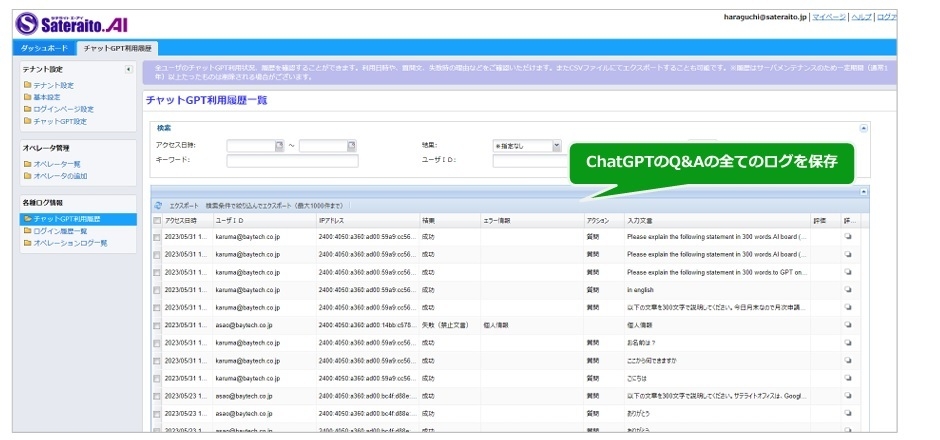 ●利用ユーザーを限定。ユーザーとChatGPTとのQAのログを保存