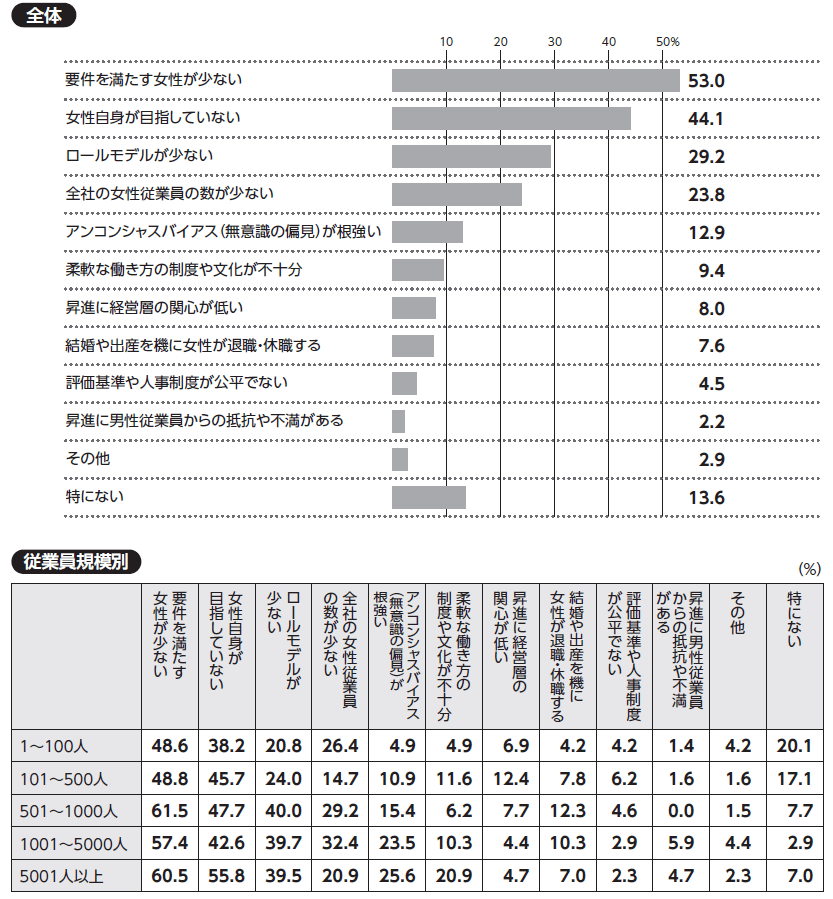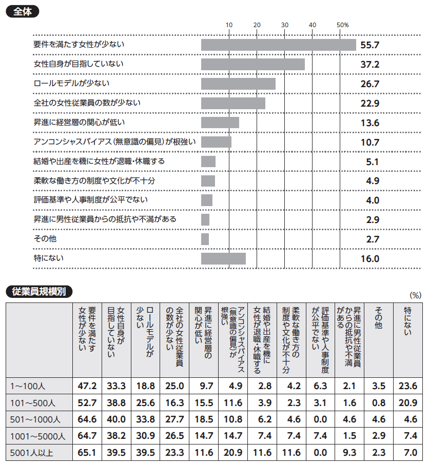 女性を昇進させる課題「要件を満たす人が少ない」「女性が目指していない」 「女性の数が少ない」「ロールモデルの不在」「アンコンシャスバイアス」