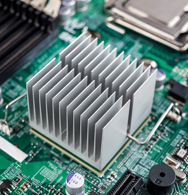 ヒートシンクとは、金属の高い熱伝導性を利用して放熱、排熱を行う部品です。空気に触れる面積が広ければ広いほど放熱効率が向上するので、単なる一枚板ではなくフィン形状の複数の板が付いた形状が一般的です。