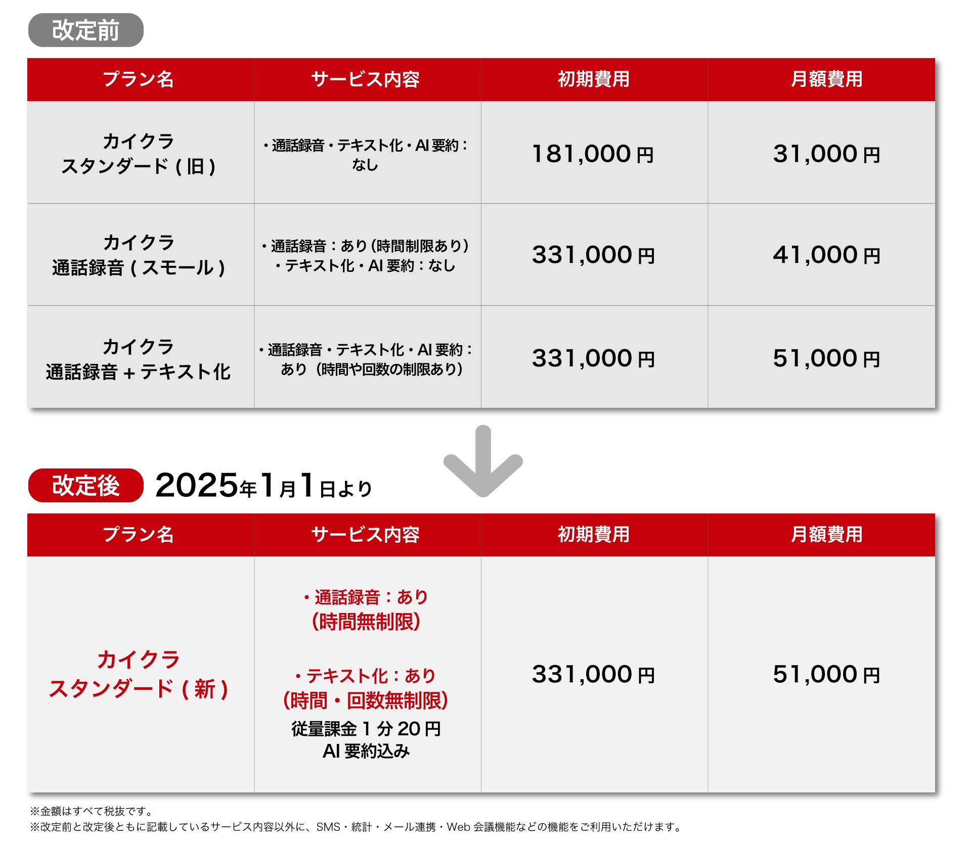 シンカは2014年8月のサービス開始以来、コミュニケーションプラットフォーム「カイクラ」の機能拡張を定期的に実施してまいりました。お客様ひとり一人の声を大切にし、2024年9月末現在で全国2,700社を超える幅広い業種の企業にご利用いただいております。このたび、円安の影響やインフラコストの増大等による事業環境の変化を受け、2025年1月1日以降に販売するプランについて利用価格の改定を行うことになりました。