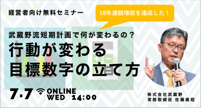 株式会社武蔵野(東京都小金井市、代表取締役社長:小山昇、以下武蔵野)は、7月7日(水)14:00から「行動が変わる目標数字の立て方」と題して、60分間の経営者向け無料オンラインセミナーを開催します。現在、新型コロナワクチンの普及が進んでいますが、6月29日朝刊日本経済新聞の社長100人アンケートでは、現状の景気感について「横ばい」という意見が59.7%と最も多くなっています。個人消費の減速や物流停滞により事業環境が安定せず、今まで以上に経営計画策定が重要になる今、年間で100回以上経営者向けに講演を行う常務取締役佐藤が、実例をもとに成果の出る計画作成方法の秘訣をお話します。