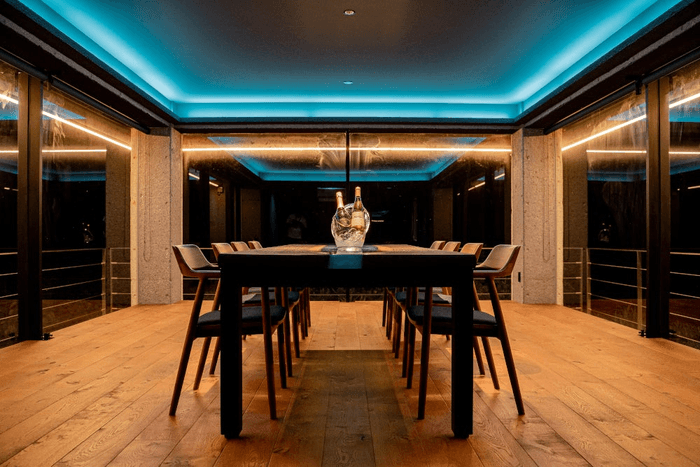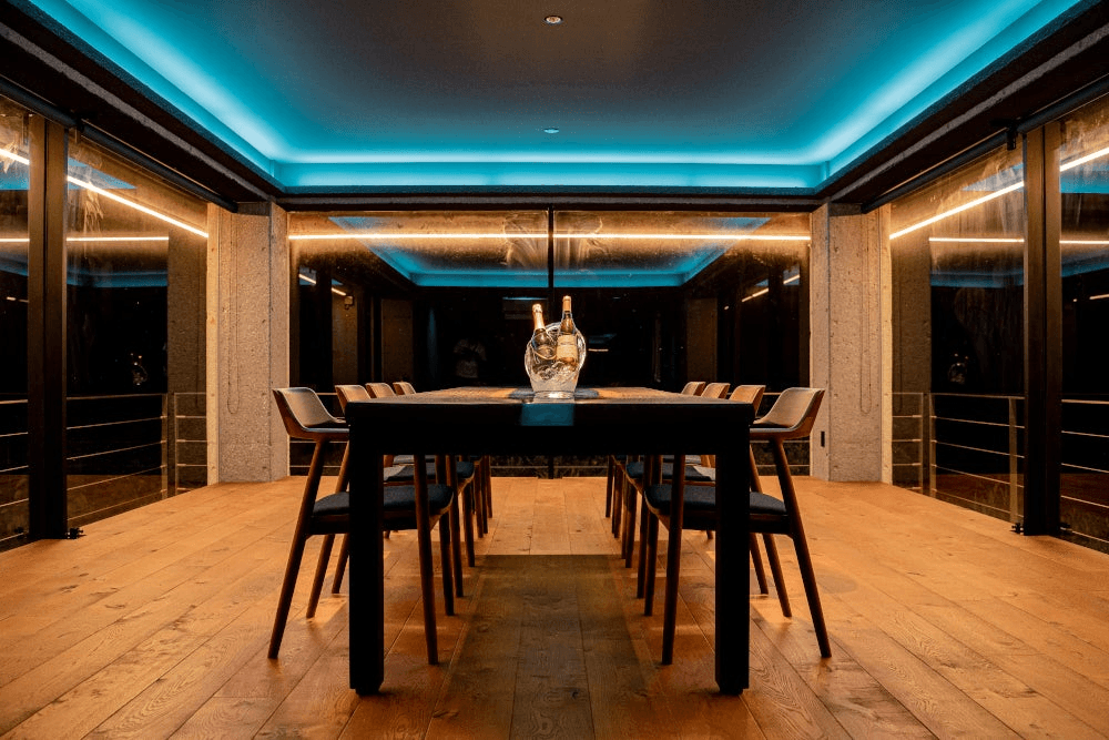 広々としたリビングルームでは、昼の自然光が差し込み、夜は間接照明のシックな空間に。