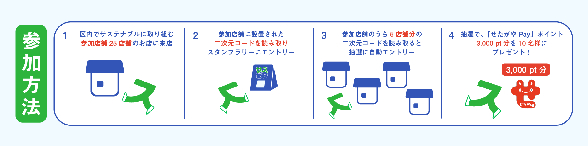 このスタンプラリーでは、せたがやPayアプリ内のデジタルスタンプラリー機能を用い、参加者にお店を巡っていただきます。開催期間中に、5店舗を訪れた方に抽選で「せたがやPay」ポイント3,000ptを、10名様にプレゼントします!