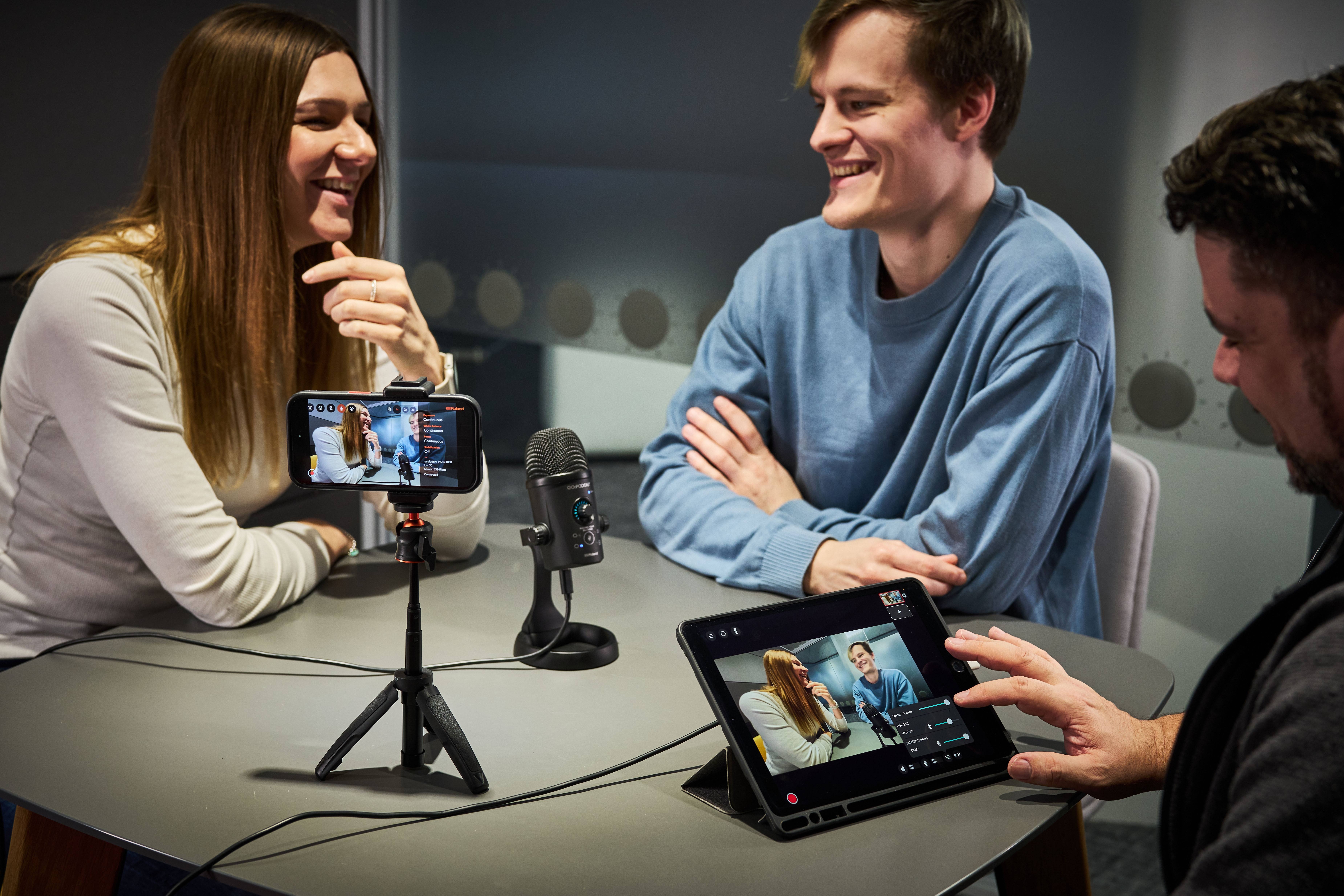 『GO:PODCAST』では、多くの方がお持ちのiOS/Androidデバイスですぐに配信を始めることができます。マイクをUSB-Cケーブルでデバイスに接続し、モニター用のヘッドホンやイヤホンをステレオミニ・ジャックに繋ぎます。そして「GO:PODCASTアプリ」を立ち上げてカメラの設定を行えば、TwitchやYouTube、Facebook、そのほかの配信プラットフォームに直接配信を始めることができます。