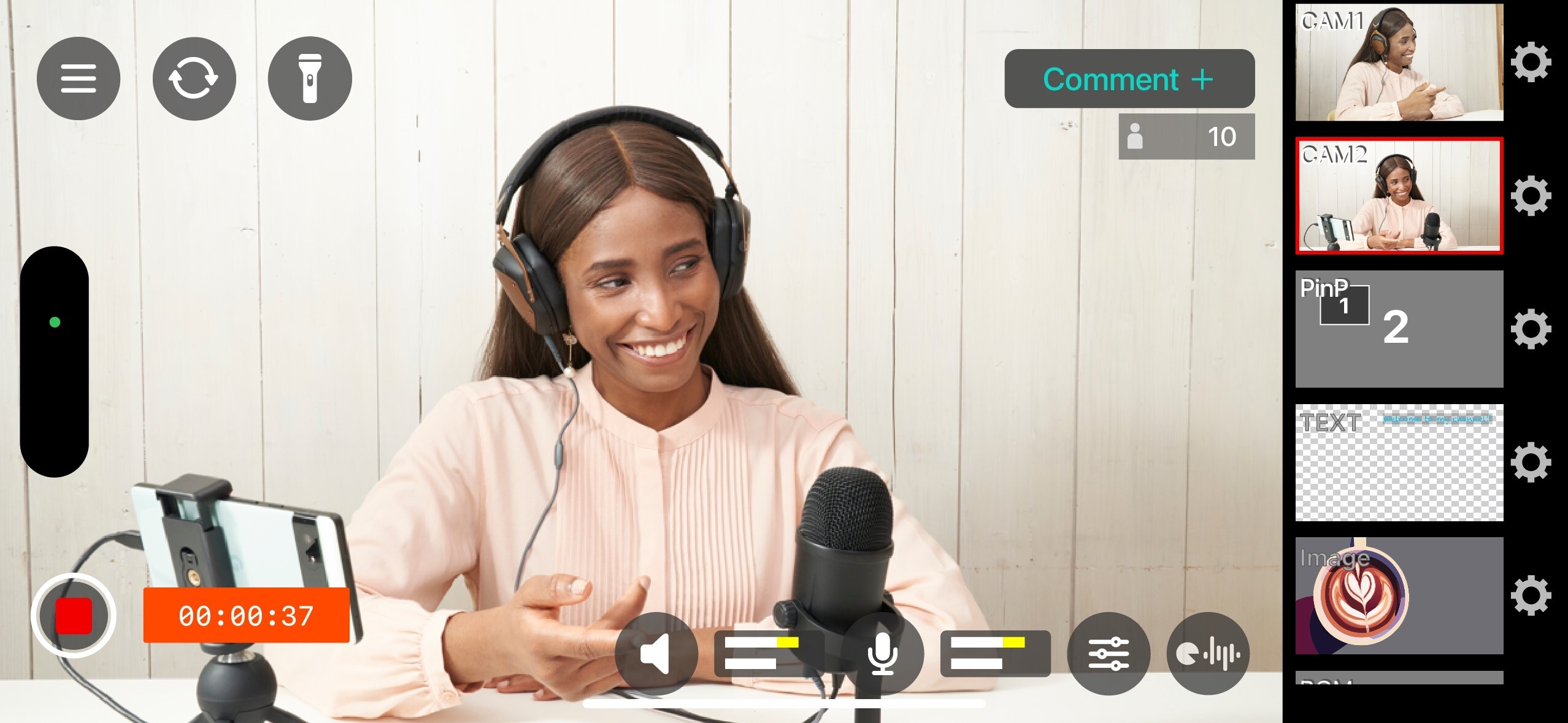 配信の目的に合わせて柔軟に撮影の設定が可能です。対談形式の配信には背面のカメラも同時に収録に使用して(※1)対談の相手も撮影することができます。また、もう1台モバイル・デバイスを用意して、カメラアプリ「Roland Satellite Camera」をインストールすれば、ワイヤレス・カメラとして利用できます。さらに、スマホやタブレットでのゲームのプレイ画面を共有して(※2)魅力的なゲームプレイで視聴者を沸かせることができます。編集やコンテンツ作成のためにカメラの映像を分けて収録することも可能です。