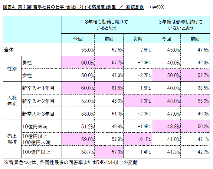新卒入社1~3年目の男女600名に「当面3年間に対する仕事・会社に対する勤続意欲」を聞いたところ、「3年後も勤務し続けていると思う(以下、3年後も勤続)」(回答率55.0%)が「3年後は勤務し続けていないと思う(以下、3年以内に退職)」(同45.0%)を上回り、前回(同52.5%)から2.5ポイント増加しました。