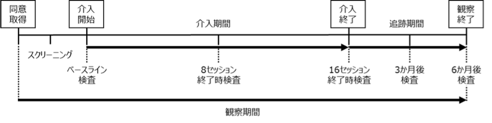 本研究は、単施設で実施する治療介入の単群、前後比較試験です。スクリーニング検査により適格性を満たした、うつ病患者に対し、原則、週1回の外来にてCBT-VRを16セッション実施します。ベースライン、8セッション終了時、16セッション終了または治療中止時の検査と、各セッション時の検査および診療に要する時間の計測と、患者質問票によりCBT-VRの実行可能性を評価します。16セッション終了後または介入中止以降の追跡期間である6か月間は希望する被験者に対してCBT-VRの使用を継続し、3か月および6か月の追跡評価を実施します。