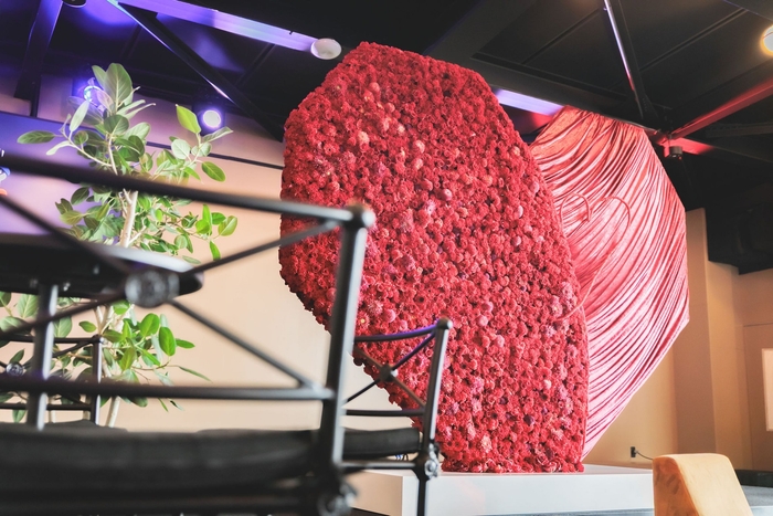 ハート型オブジェの左右で異なる素材を用いた象徴的な造形。 片側は生花で命の息吹と感情の豊かさを表現、もう片側はベロア素材のドレープで優雅さと深みを演出。赤い糸のオーナメントをハートの中心を貫くように配置し、「つながり」や「運命」を視覚化。来場者に作品を通して“見る・感じる・撮る”体験を提供し、記憶に残る演出に。