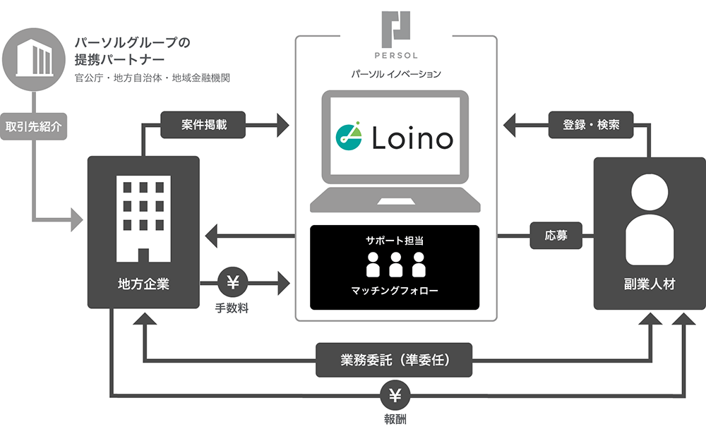 「Loino」では、パーソルグループのビジネスアライアンス網と人材マッチングスキルを活かし、都市部人材の成長と自己実現、地方企業の発展、地方への人材還流に寄与してまいります。