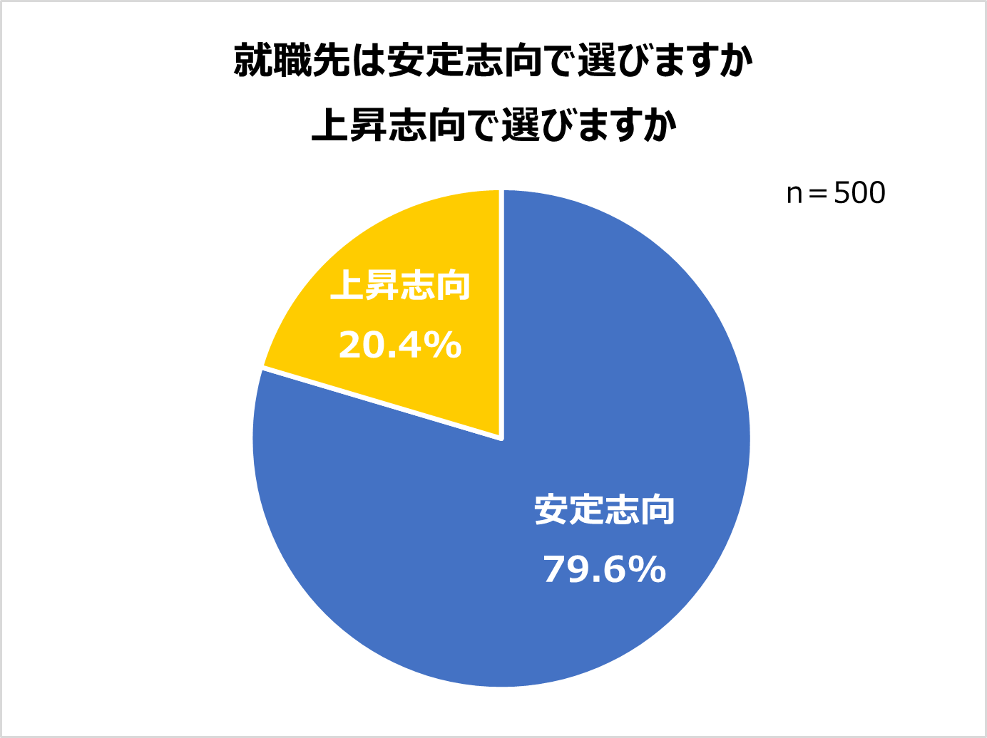 次に、就職先の選び方について聞きました。雇用や福利厚生の安定を求める「安定志向型」と、個人のスキルアップを求める「上昇志向型」で、自身はどちらのタイプで就職先を選ぶかを尋ねると、約8割が「安定志向(79.6%)」と答え、多数派であることが分かりました。