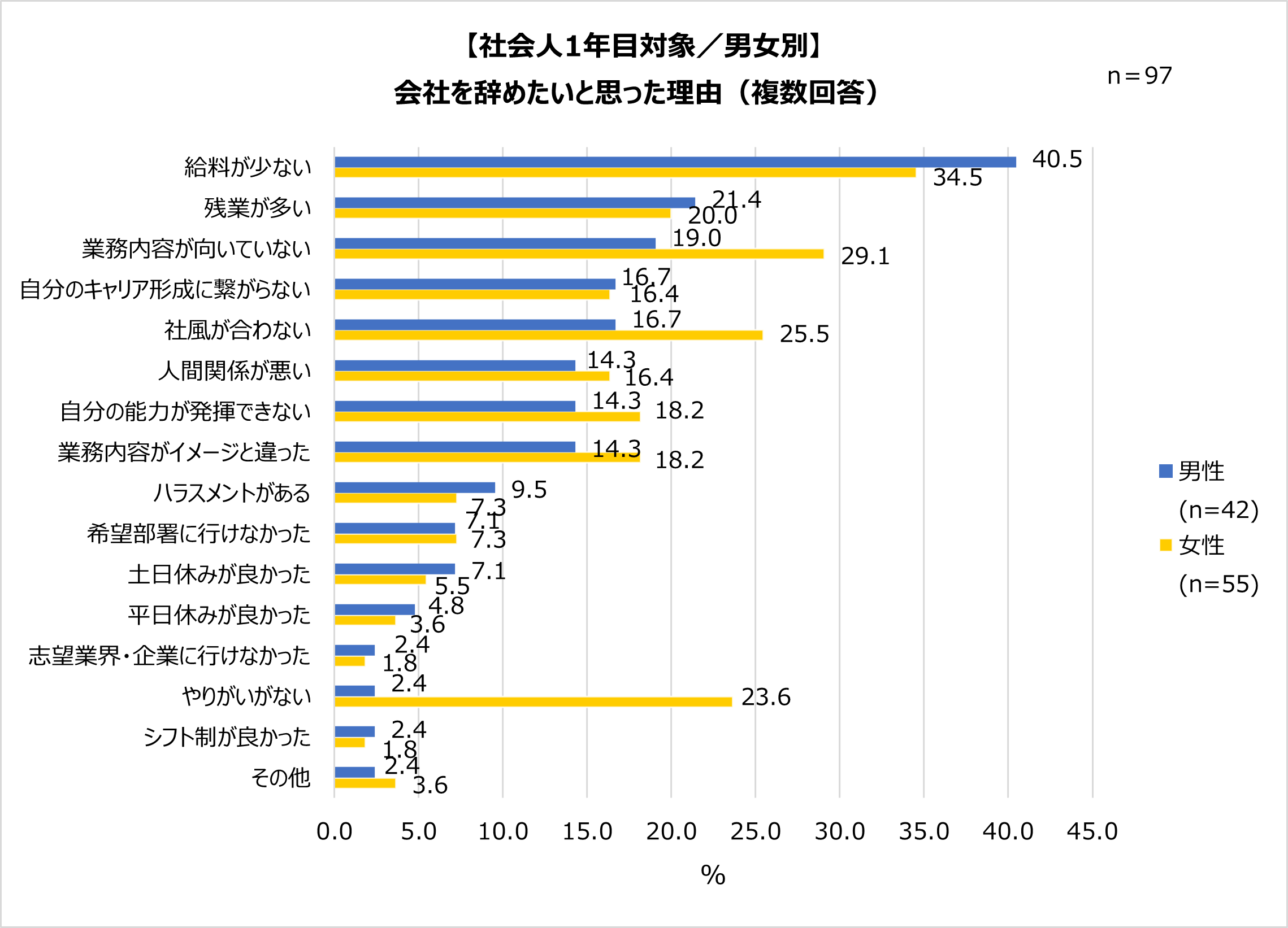 入社後にギャップを感じている人が多いことが分かりましたが、会社を辞めたいと思ったことはあるのでしょうか。調べると、「とてもある(22.0%)」と「ある(35.7%)」を合わせて、約6割が会社を辞めたいと思ったことがあると答えました。その理由を見ると、最も多かったのは男女ともに「給料が少ない(男性40.5%、女性34.5%)」でした。次に、男性は「残業が多い(21.4%)」、女性は「業務内容が向いていない(29.1%)」が多い結果に。これらが仕事に対するモチベーションに影響していることが分かりました。