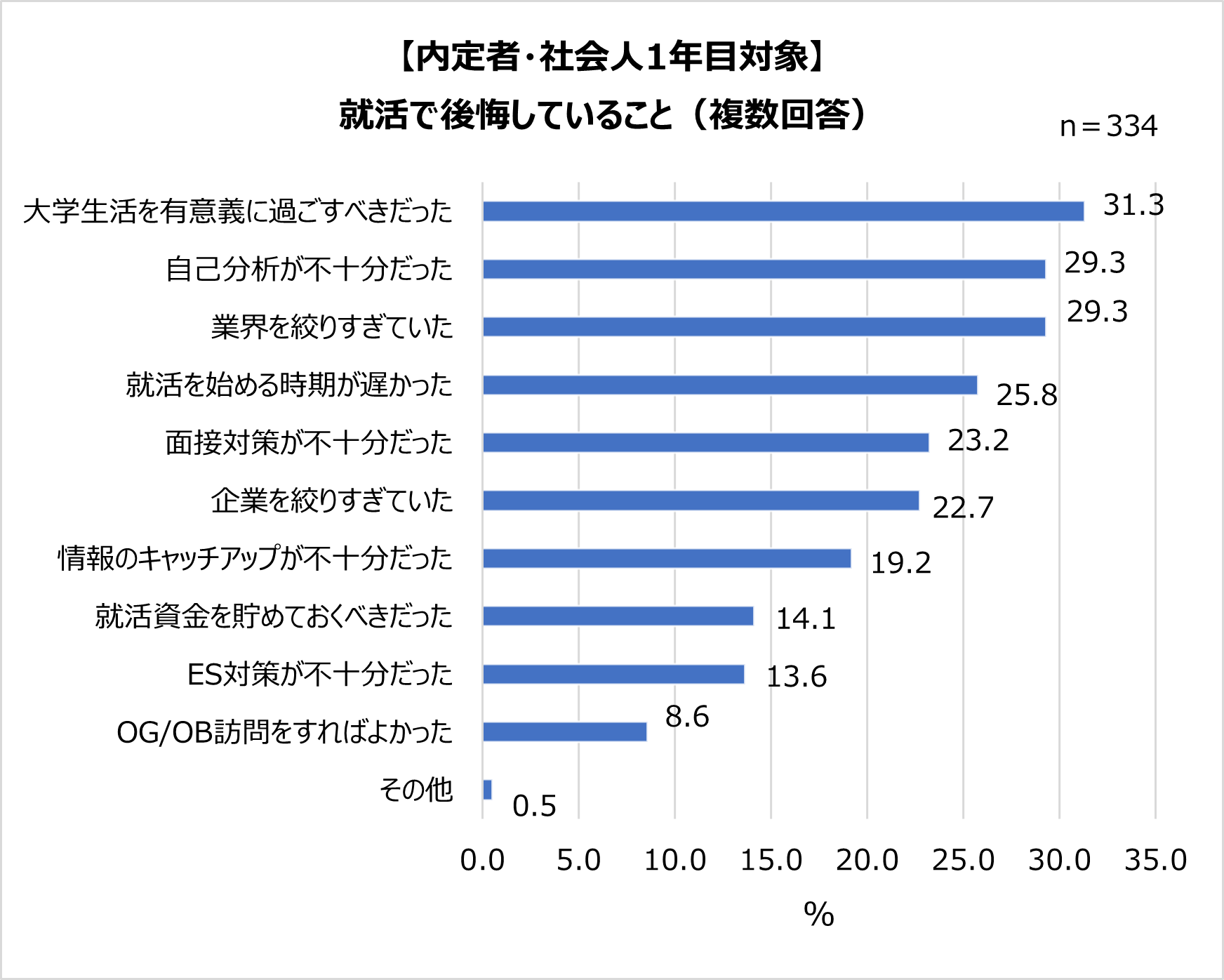 まず自身の就活については、約6割の人が「後悔がある(59.3%)」と回答。3割以上が「大学生活を有意義に過ごすべきだった(31.3%)」と、大学生活の過ごし方に後悔を感じていました。また、「自己分析が不十分だった(29.3%)」や「業界を絞りすぎていた(29.3%)」といった後悔を感じている人も多く見られました。