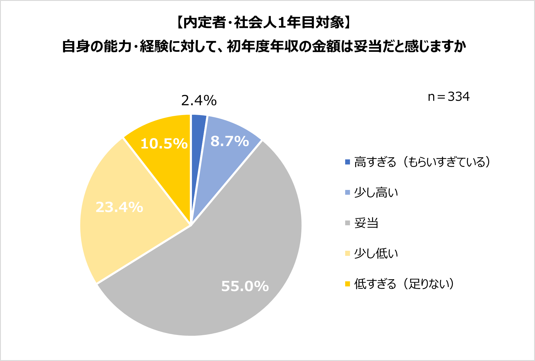 自分の能力・経験に対して、この初年度年収が妥当だと思うかを尋ねると、約3人に1人が「少し低い(23.4%)」、「低すぎる(10.5%)」と答えました。金額が足りていない、と不満に感じている人が一定数いるようです。