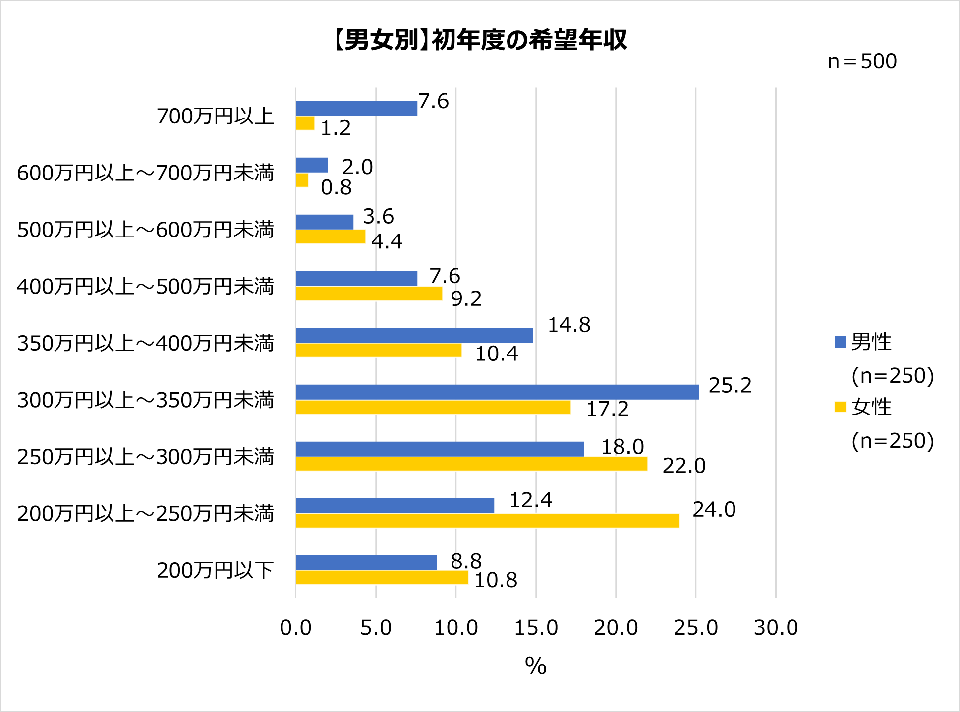 企業選びで重視するポイントとして、また、入社後の後悔として挙げられた「給料」。次は、この「給料」に焦点を当てて調査をとりました。まず、初年度の希望年収を聞くと、最も票が集まったのは「300万円以上~350万円未満(21.2%)」で、比較的堅実な傾向がうかがえました。男女別でデータを見ると、男性は「300万円以上~350万円未満(25.2%)」、女性は「200万円以上~250万円未満(24.0%)」が最多で、希望年収に男女差があることも分かりました。