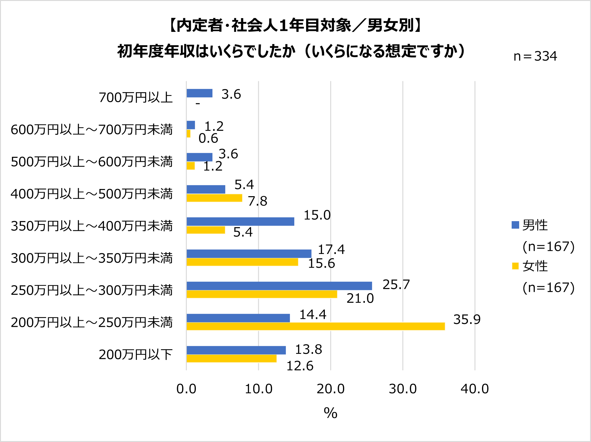 一方、内定者と社会人1年目を対象に、実際の初年度年収がいくらかを尋ねると、「200万円以上~250万円未満(25.1%)」が最も多い結果に。希望していた「300万円以上~350万円未満」をもらう人は16.5%に留まりました。男女別で見ると、男性は「250万円以上~300万円未満(25.7%)」、女性は「200万円以上~250万円未満(35.9%)」でした。