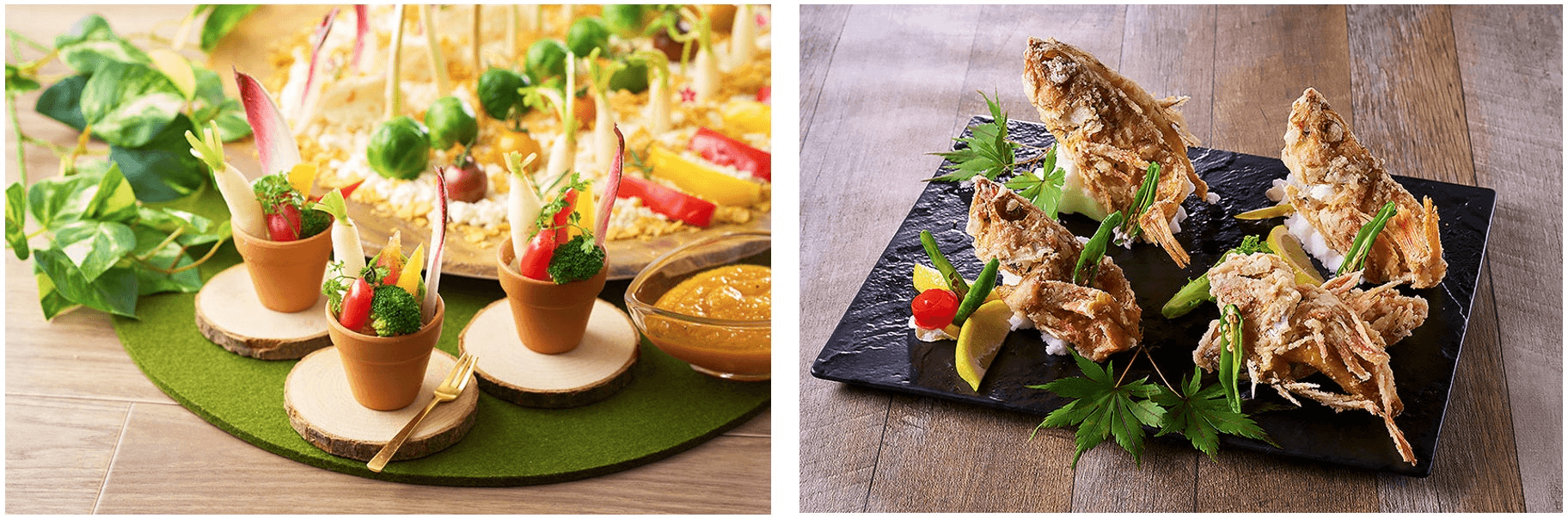 左:収穫の秋をイメージした、彩り鮮やかな「野菜畑のバーニャカウダ」。気軽につまめるサイズにカットされた野菜に、人参ドレッシングをたっぷりつけてどうぞ。