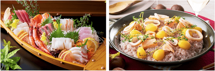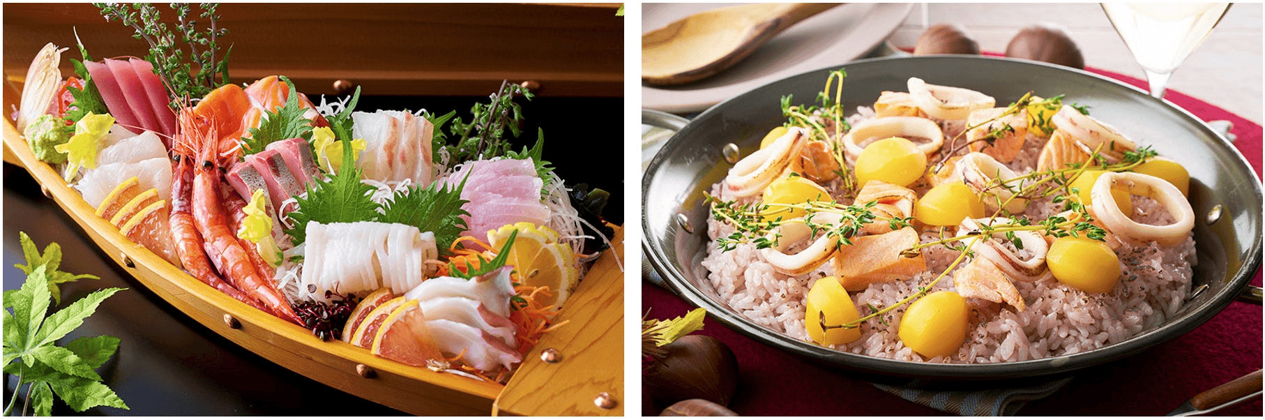 右:秋限定メニュー「天草産あおさと鮭のパエリア」。オレンジに色づく葉っぱを鮭で、黄色に色づくイチョウの葉を栗で表現した、秋をイメージした料理長渾身のメニューをお見逃しなく。